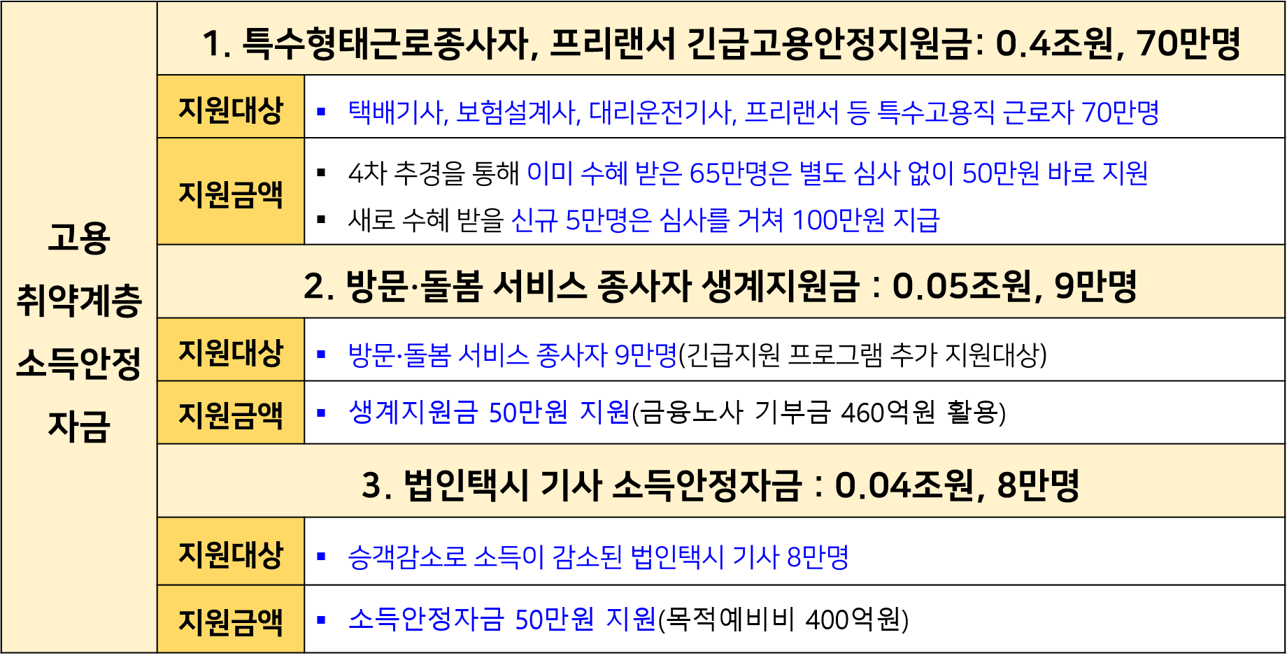 - 특수형태 근로자, 필수 노동자 및 청ㆍ장년 집중 지원
